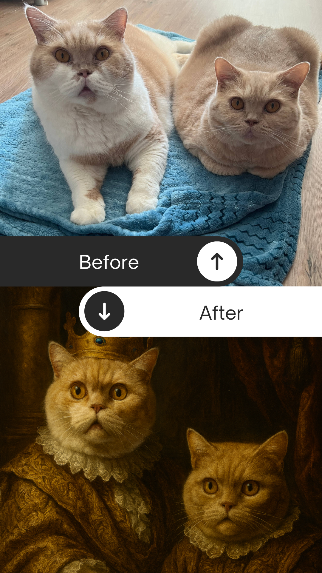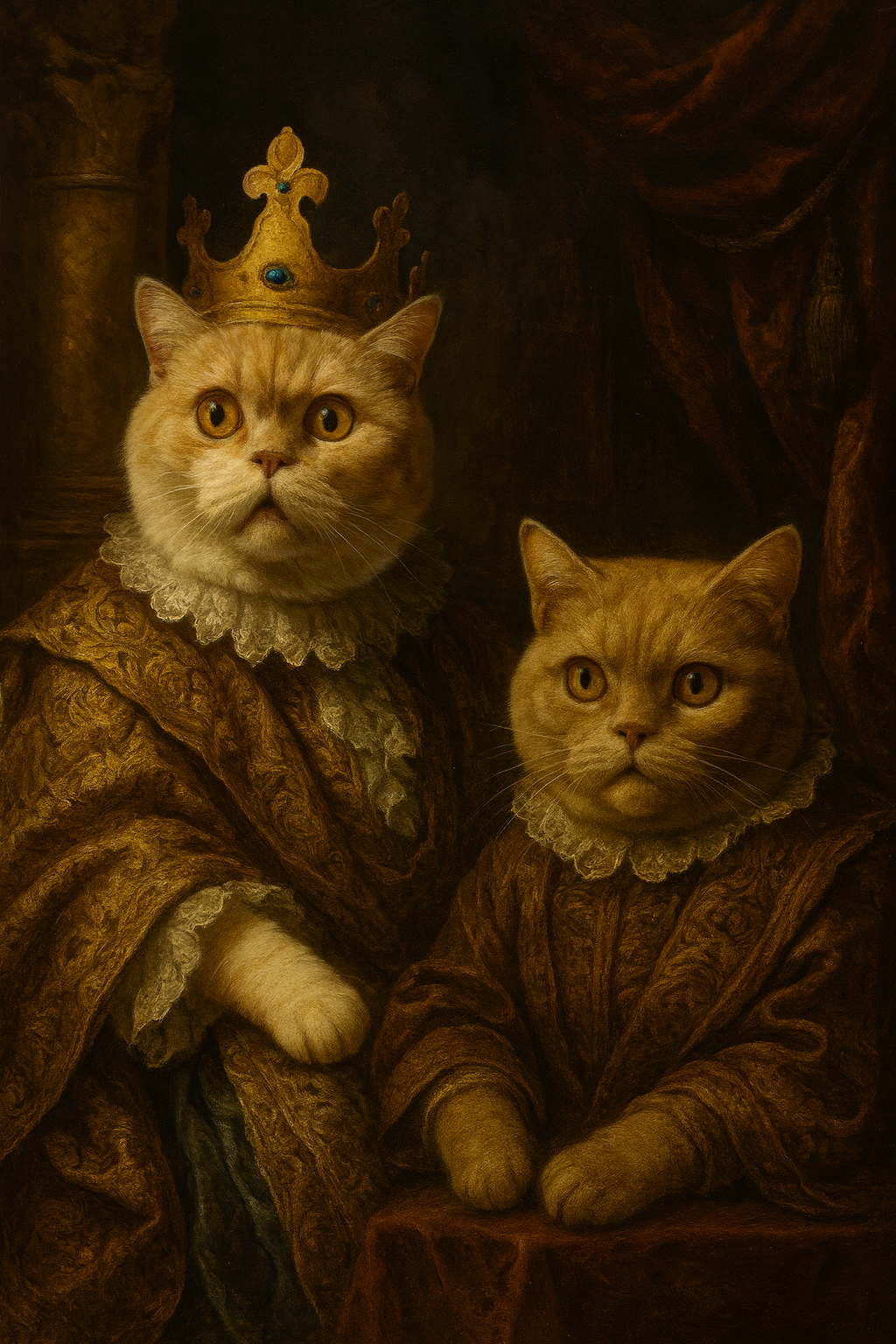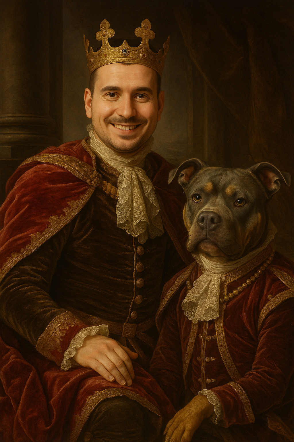 Verleihen Sie Ihrem Haustier die höchste Ehre. Wir verwandeln Ihr Lieblingsfoto in ein majestätisches, hochdetailliertes Porträt im königlichen Barockstil, inspiriert vom 17. und 18. Jahrhundert.