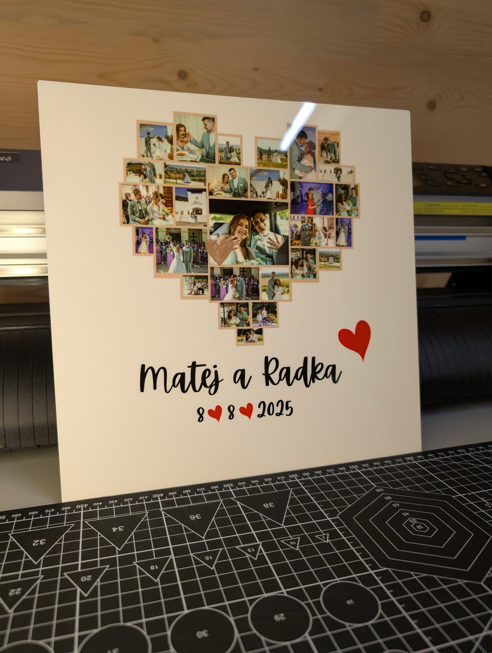 Ihre Bilder werden zu einer Collage in Herzform zusammengestellt und mit Namen und Datum ergänzt – mit intensiven Farben, hoher Schärfe und modernem Galerie-Look.